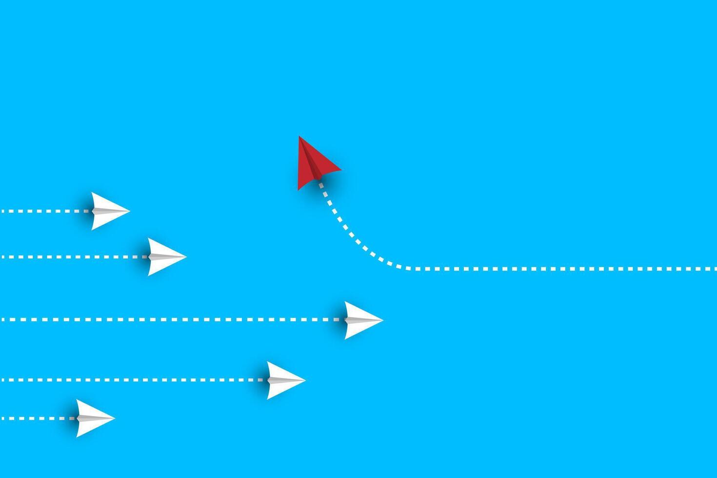 Group of white paper plane in one direction and one red paper plane pointing in different way on blue background. Pro Vector