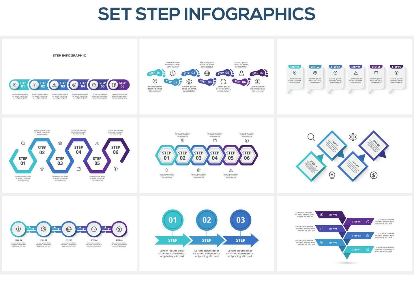 Set step with 3, 4, 5, 6, 7 elements, infographic template for web, business, presentations, illustration. Pro Vector