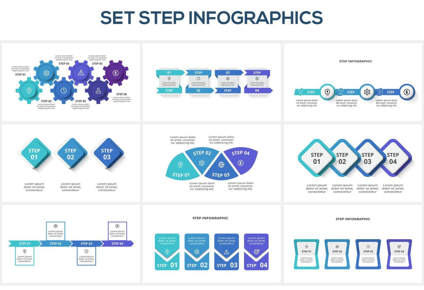 Set step with 3, 4, 6 elements, infographic template for web, business, presentations, illustration. Pro Vector