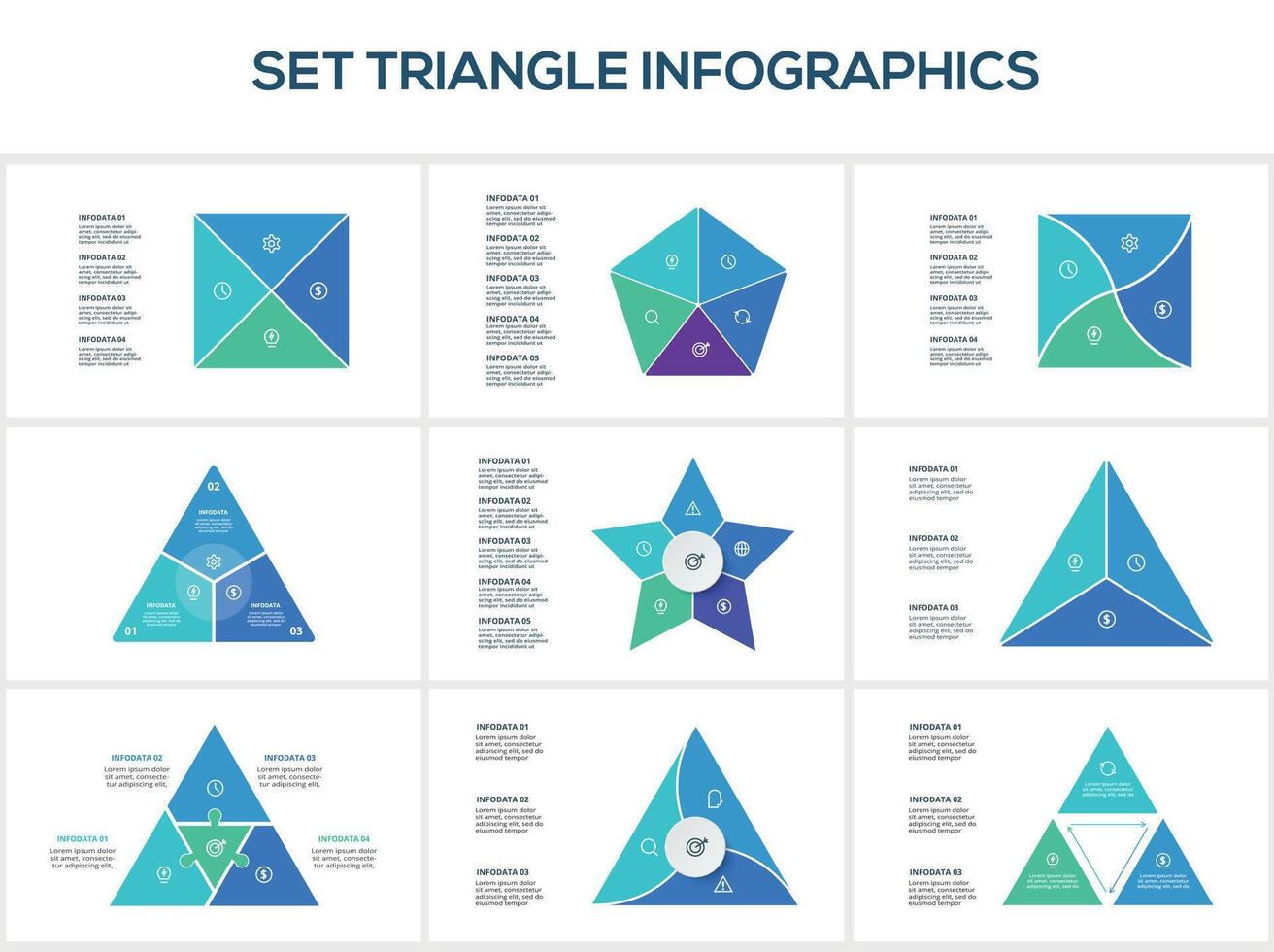 Set triangle with 3, 4, 5 elements, infographic template for web, business, presentations, illustration. Business data visualization. Pro Vector