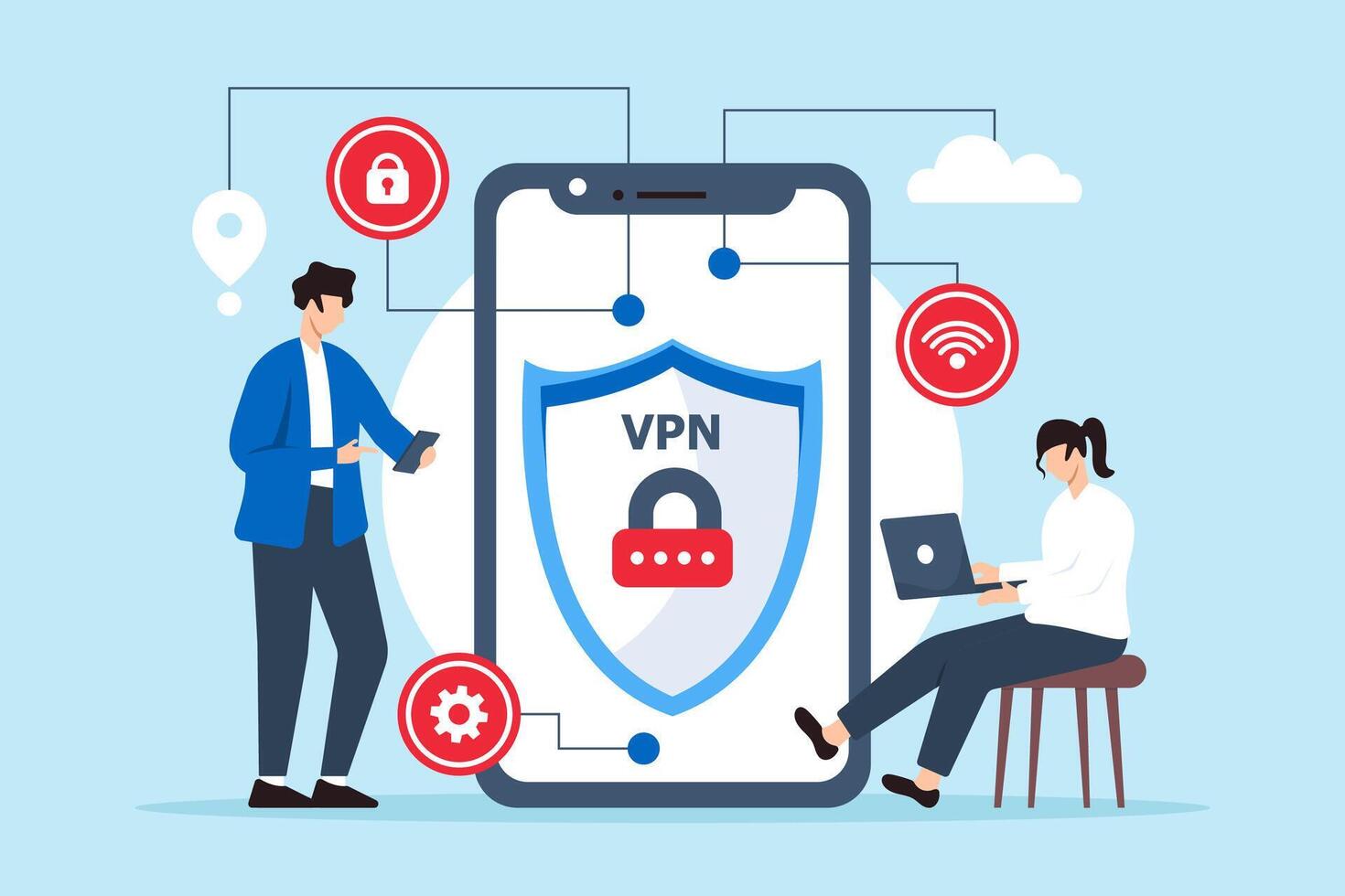 Flat illustration of two people setting up vpn virtual private network to secure internet connection Pro Vector