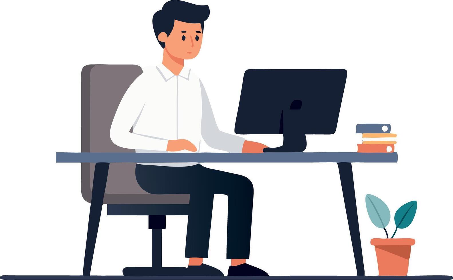 Young man working at a desk with computer and books in a modern office setting Pro Vector