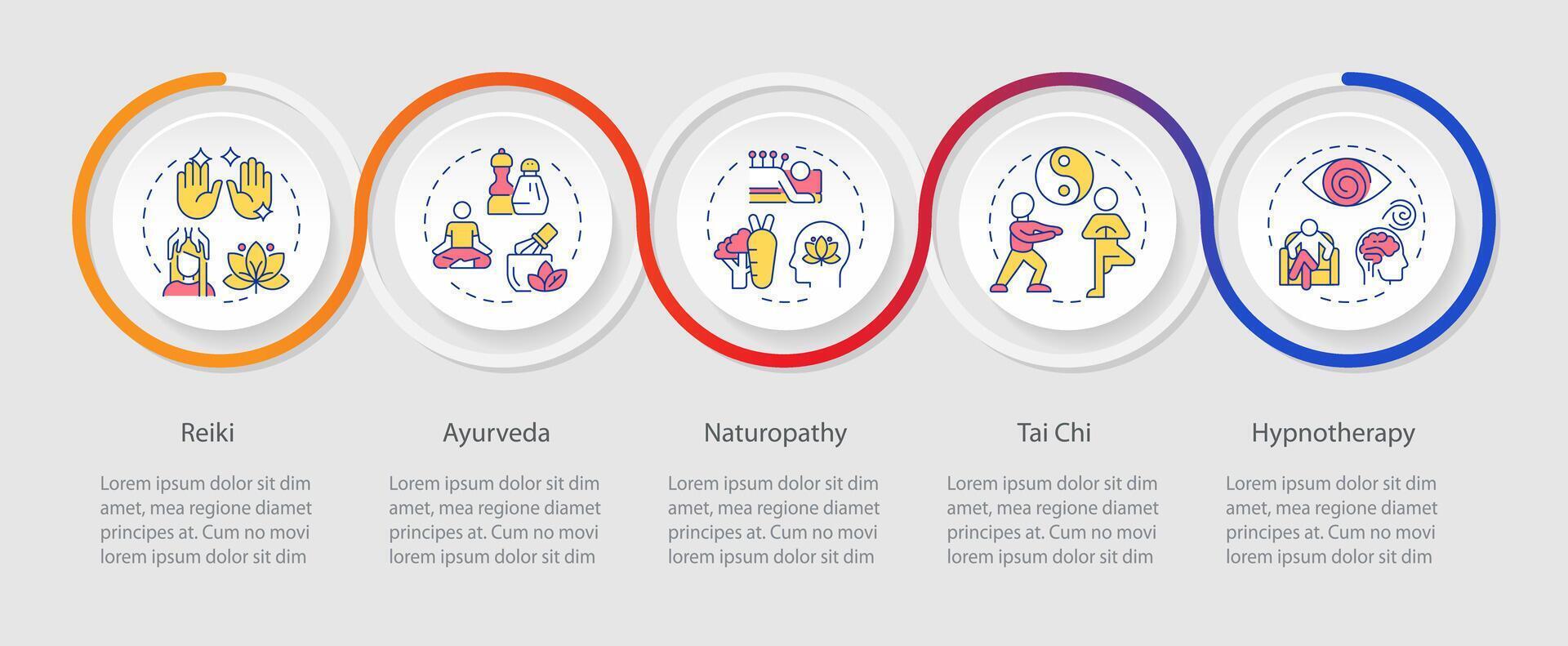 Alternative mental therapies infographics circles sequence. Spiritual healing, ayurveda. Visualization layout with 5 steps. Info chart loop process presentation Pro Vector