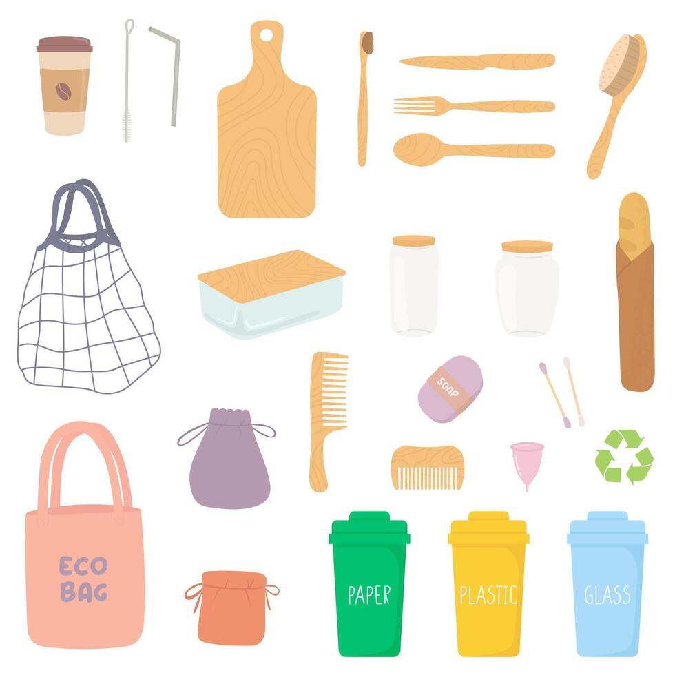 Big zero waste elements set. Waste sorting. No plastic. Hand drawn elements on white background. vector