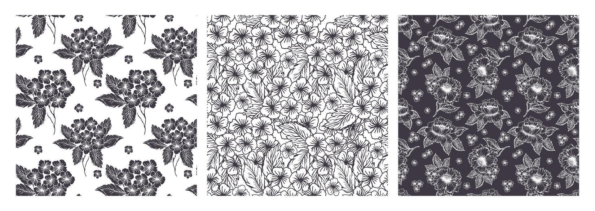 Spring hydrangea and peony silhouette and line art flower seamless pattern set with line art monochrome flower. Little flower background. Pro Vector