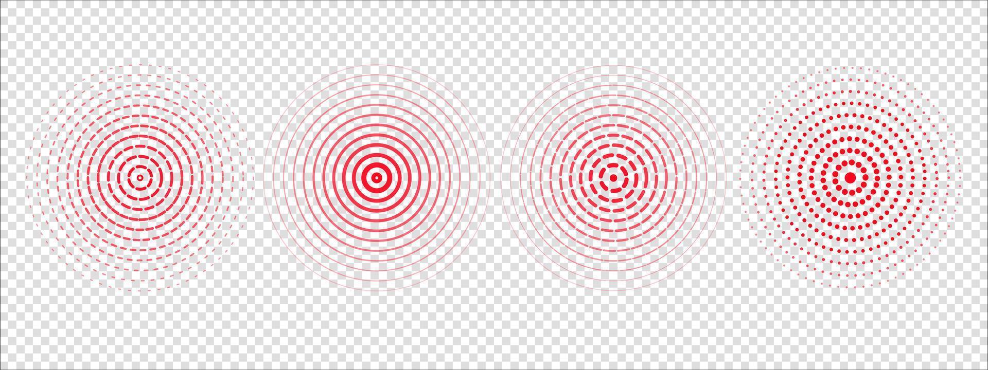 Set of red sound wave rings, of lines, linear dashes. Rings with radial lines. Target icon, epicenter. Concentric vortex circles. illustration Pro Vector