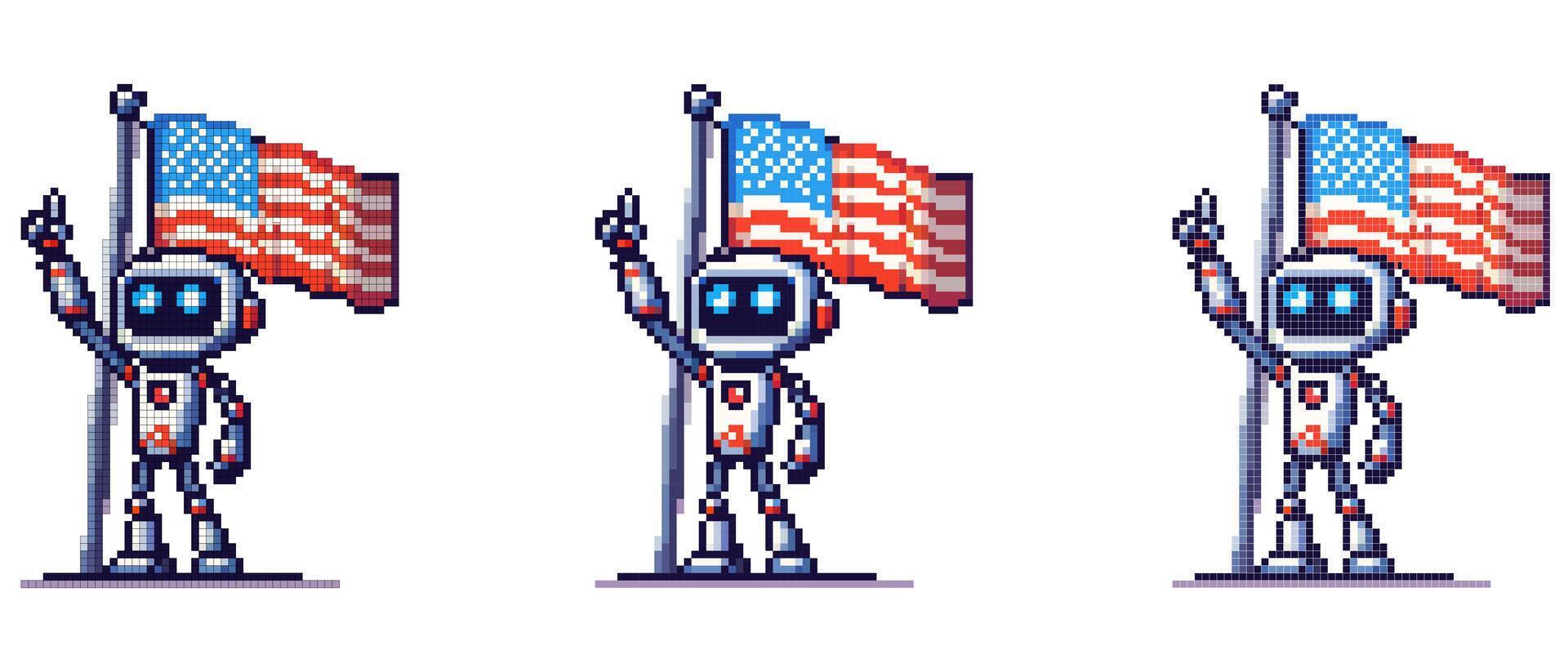 Pixel robot with a flag. Illustrates technology, robotics and personality in a playful, retro style. Pro Vector