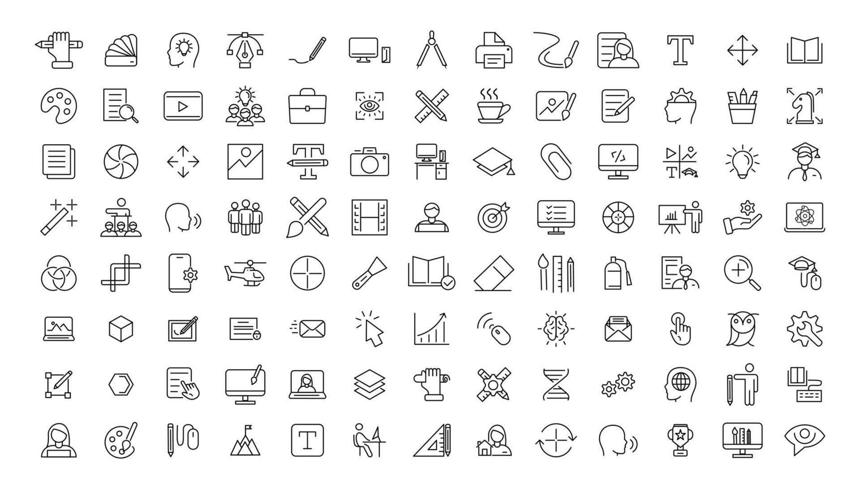 Set of thin line icons of graphic design. Simple linear icons in a modern style flat, Creative Process. Graphic design, creative package, stationary, software. Pro Vector