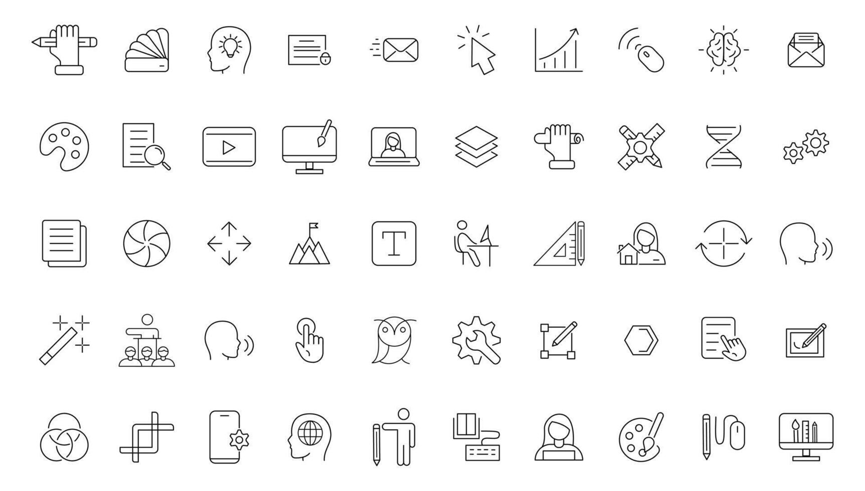 Set of thin line icons of graphic design. Simple linear icons in a modern style flat, Creative Process. Graphic design, creative package, stationary, software. Pro Vector
