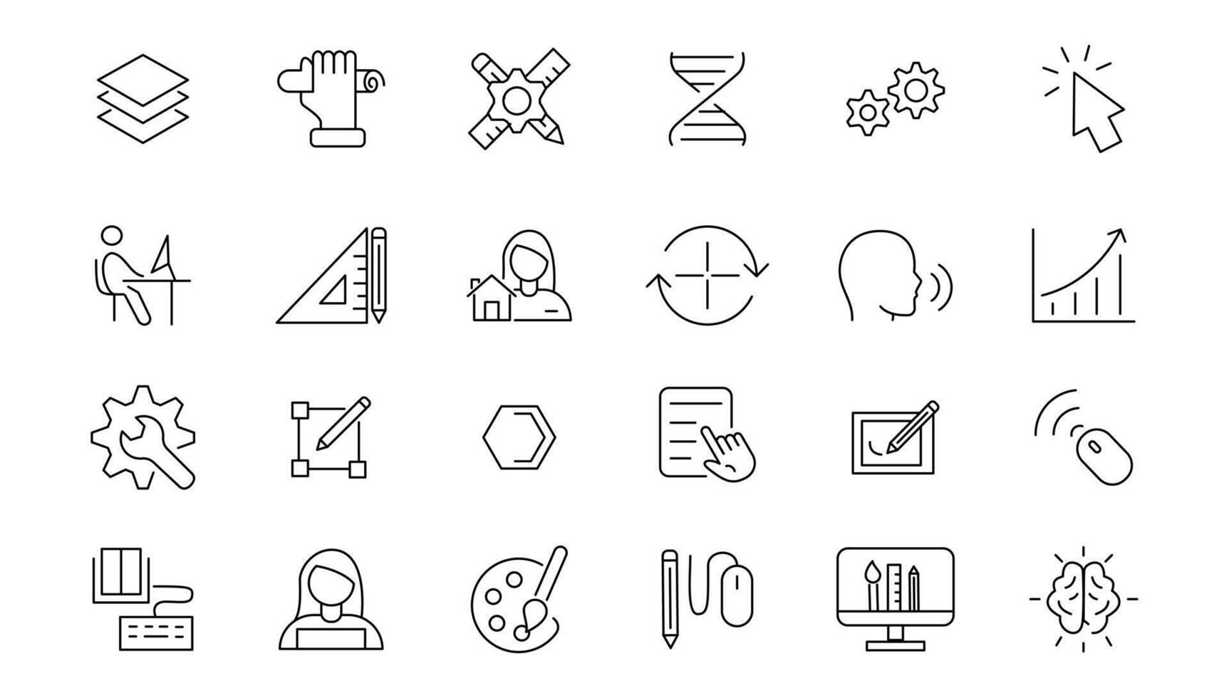 Set of thin line icons of graphic design. Simple linear icons in a modern style flat, Creative Process. Graphic design, creative package, stationary, software. Pro Vector