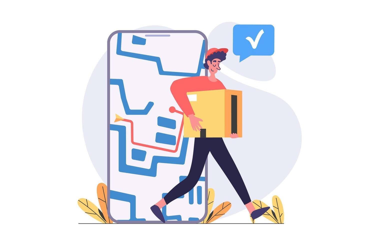 Delivery concept in modern flat design for web. Man courier shipping parcel box and distributing orders to client at home with online route tracking service in mobile application. illustration. Pro Vector
