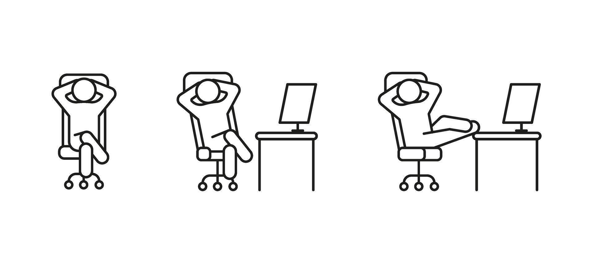 Person relax on work chair on computer, line icon set. Man rest on workplace, calm on chair. Lazy tired person, break time. illustration Pro Vector