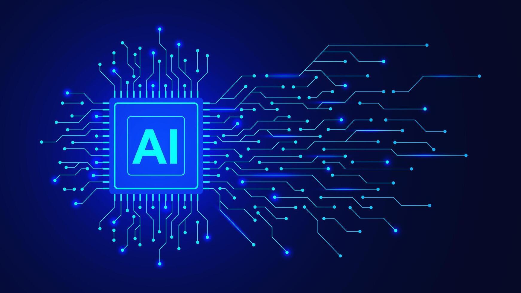 Artificial intelligence concept with microchip and electronic circuit board on dark blue background. Machine learning and high digital technology Pro Vector