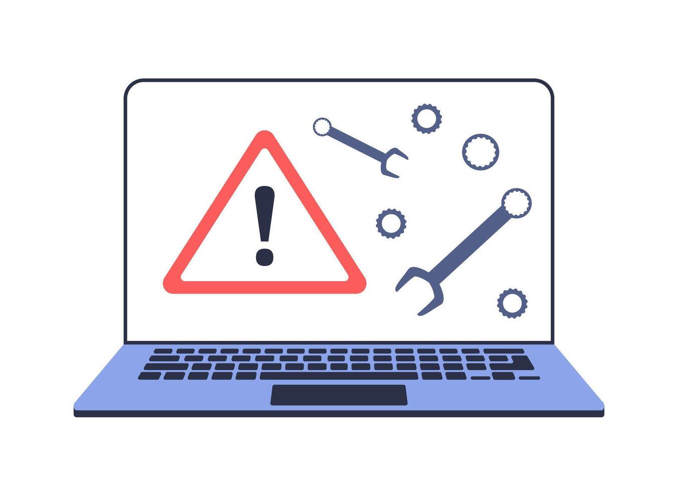 Illustration of a broken laptop. Error warning sign on the screen. image of a broken or repaired computer Pro Vector