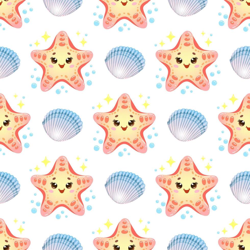 Children's seamless pattern with cute smiling starfish with bubbles and shell on a white background. illustration Pro Vector