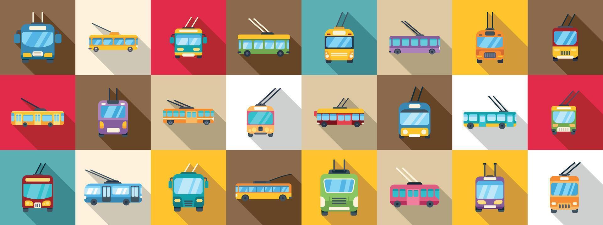 Trolleybus icons set. Set of trolleybus icons showing public transport with long shadow Pro Vector