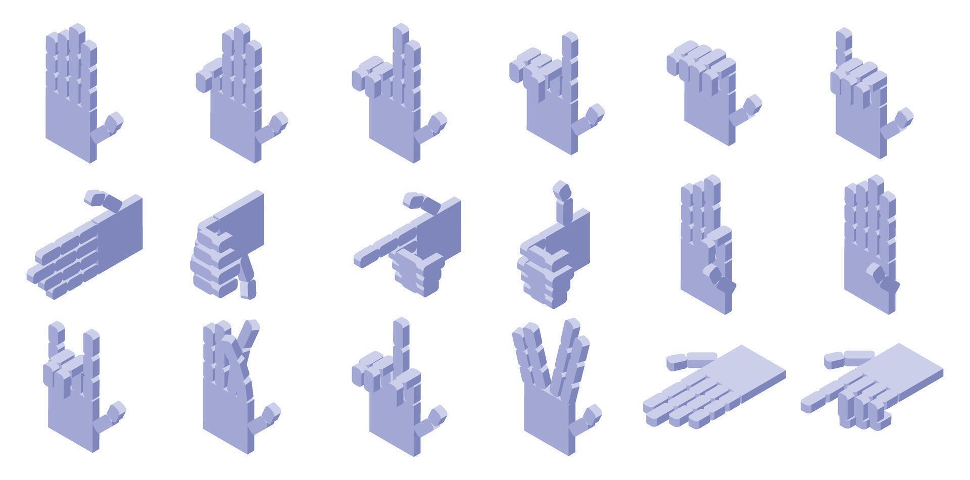 Robot hand gestures icons set. Set of pixel art hands making different gestures isometric icons Pro Vector