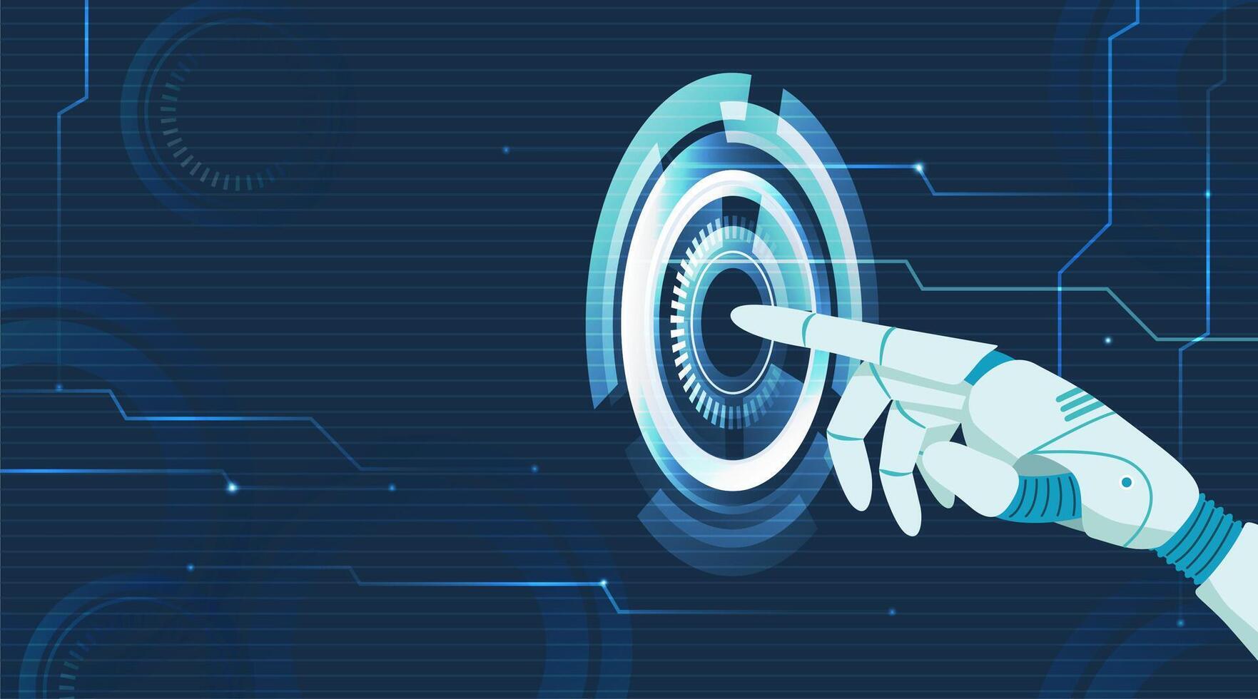 Artificial intelligence touching digital interface. Bionic hand pointing gesture to futuristic tech ui. Cyborg or AI Pro Vector