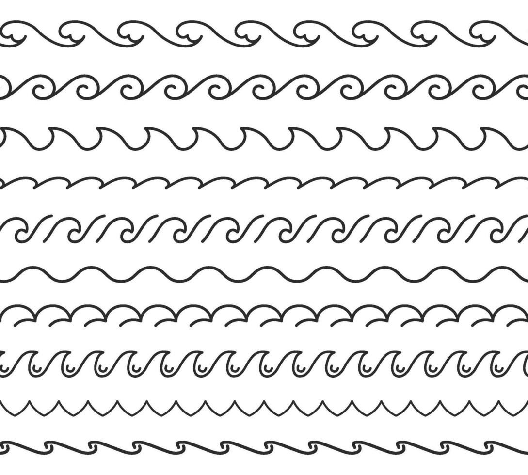Seamless line waves. Ocean water curls, sea wave crest and horizontal nautical divider pattern set Pro Vector