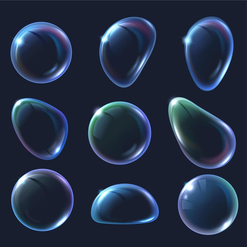 Realistic 3D soap bubble. Soapy bubbles in various shapes, iridescent glossy sphere surface and abstract blob forms isolated illustration set Pro Vector