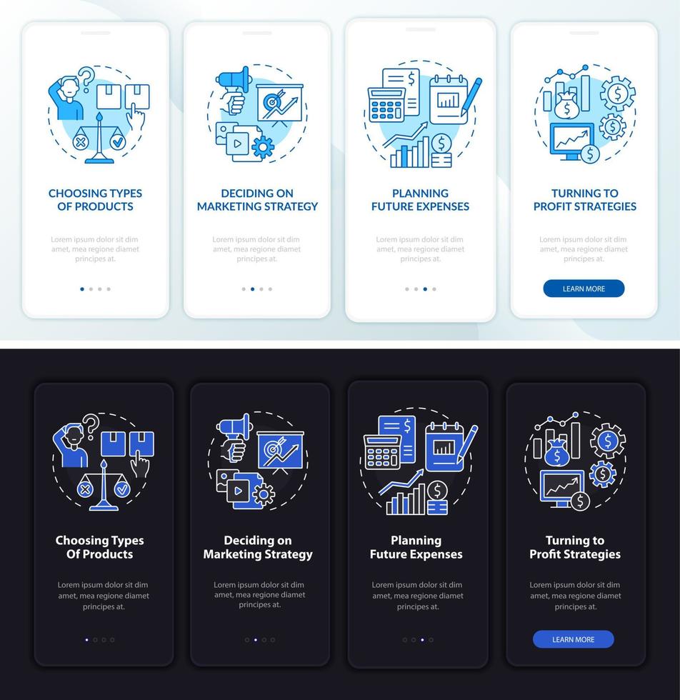 Business structures onboarding mobile app page screen. Company services walkthrough 4 steps graphic instructions with concepts. UI, UX, GUI vector template with night and day mode illustrations Pro Vector