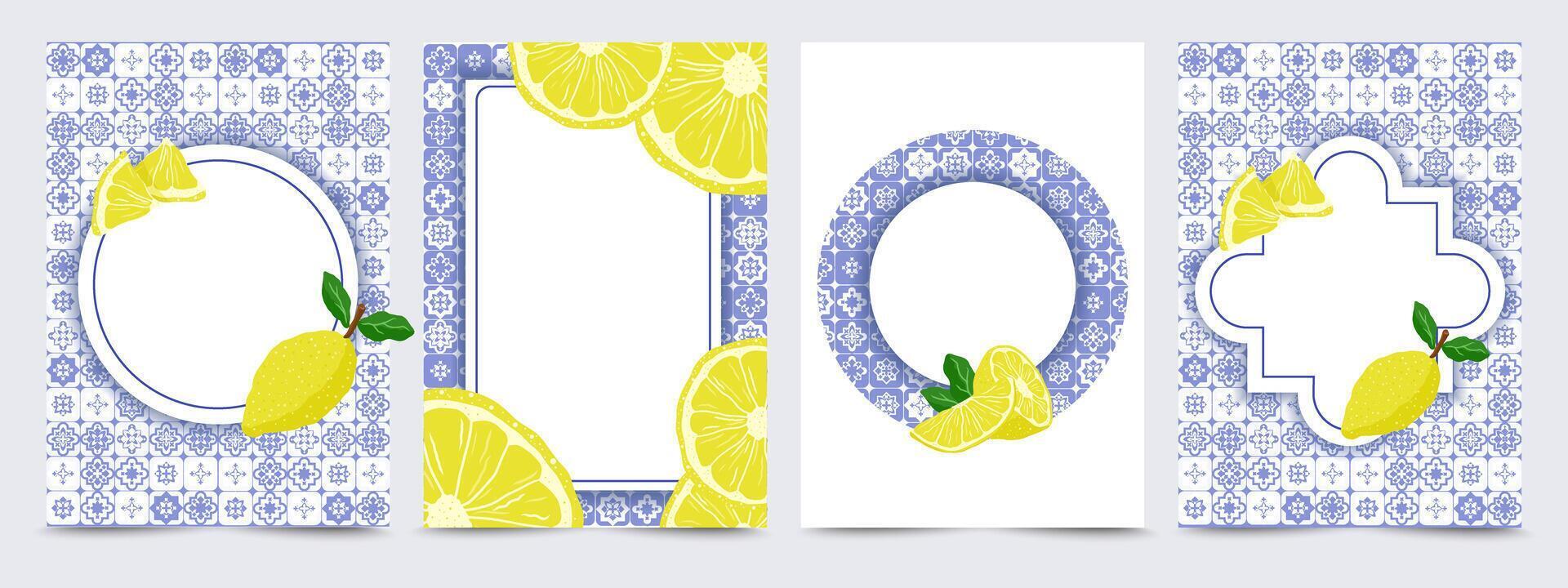Card design Template with Lemon and Blue Tile with copy space for text. Mediterranean Invitation, background, pattern, bridal party in Coastal style Pro Vector