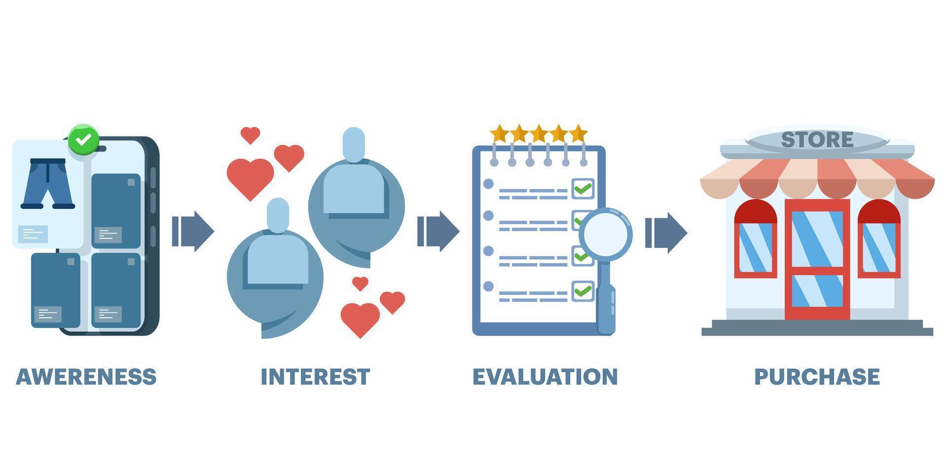 Concept of buyer's journey route, buyer's journey mapping, ordering from within an online store. Customer journey map, customer purchasing decision process, Online Business. customer experience. Pro Vector