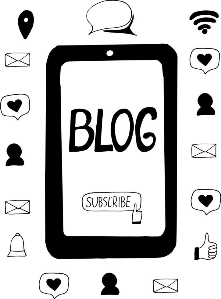 smartphone with subscribe button and blog lettering and icons around. concept, composition. sketch hand drawn doodle. blog, technology, electronics, message, communication subscribers likes Pro Vector