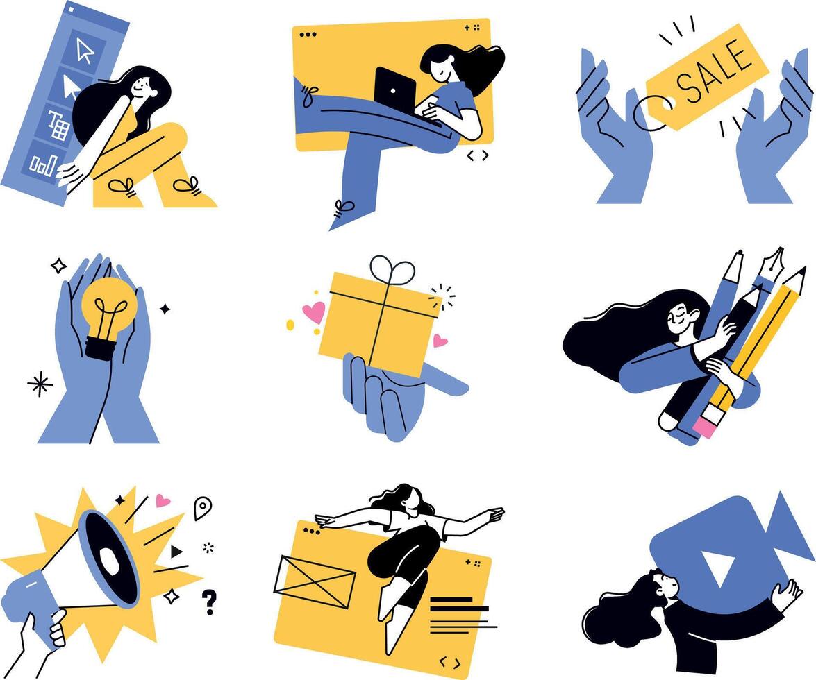 Design and marketing concept illustrations. Set of modern illustrations of digital marketing, social media and networking, graphic and web design and development, creative idea and innovation. Pro Vector