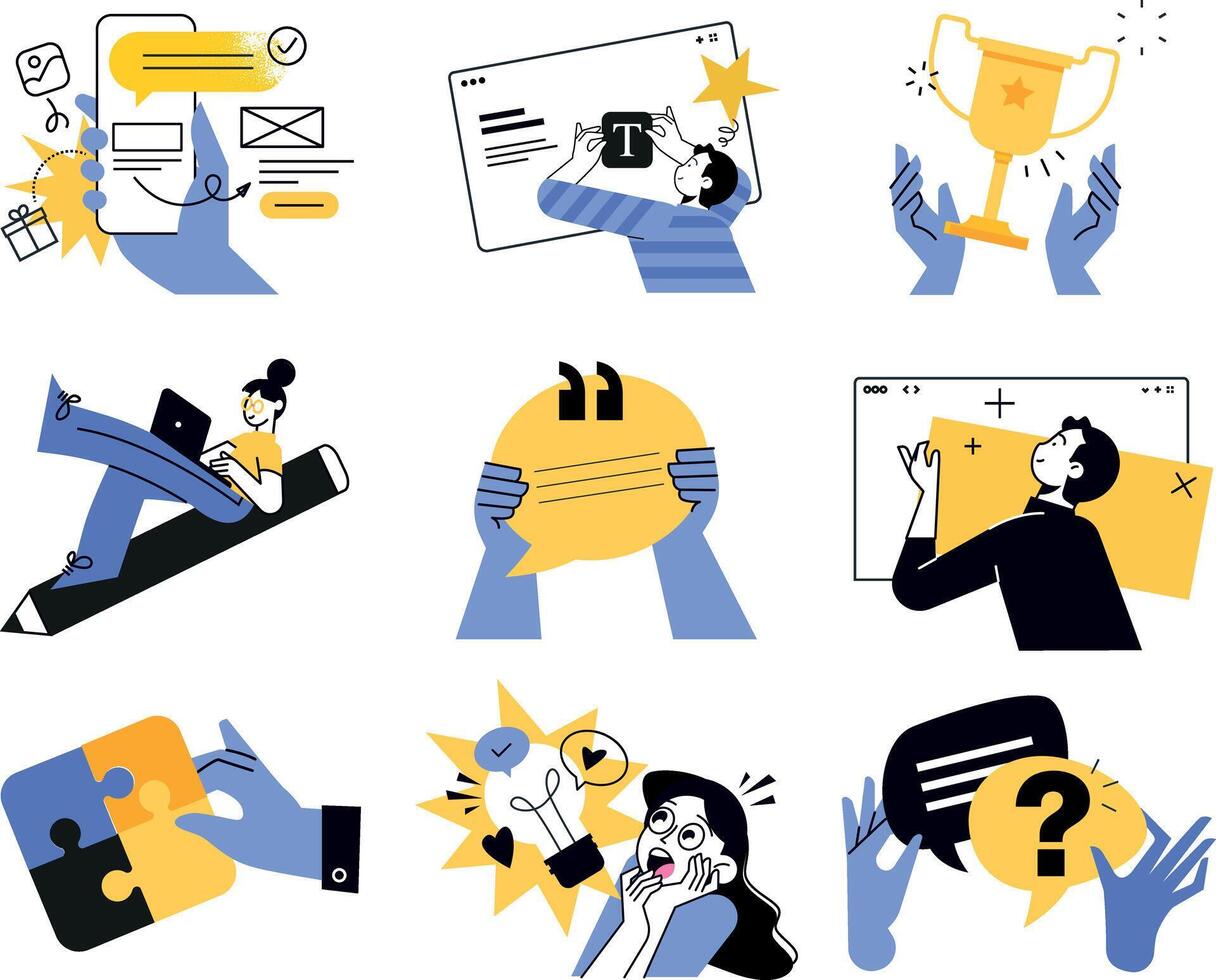 Design and marketing concept illustrations. Set of modern illustrations of digital marketing, social media and networking, graphic and web design and development, creative idea and innovation. Pro Vector