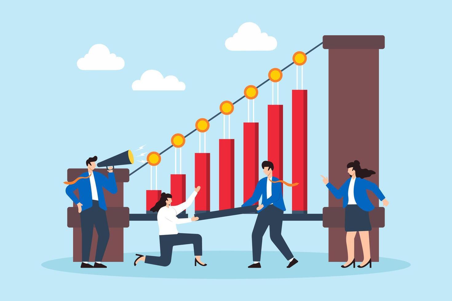 Connecting market insights, data-driven strategy, collaboration planning, achieving business growth concept illustration. Team constructing bridge with bar graphs Pro Vector