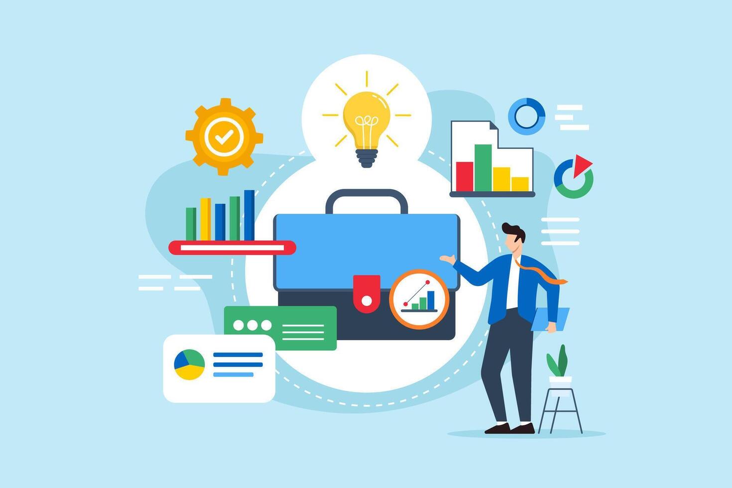 Business case development, creating compelling proposals, justifying investments and analysis projects concept illustration. Analyst with briefcase presenting graphs and charts Pro Vector