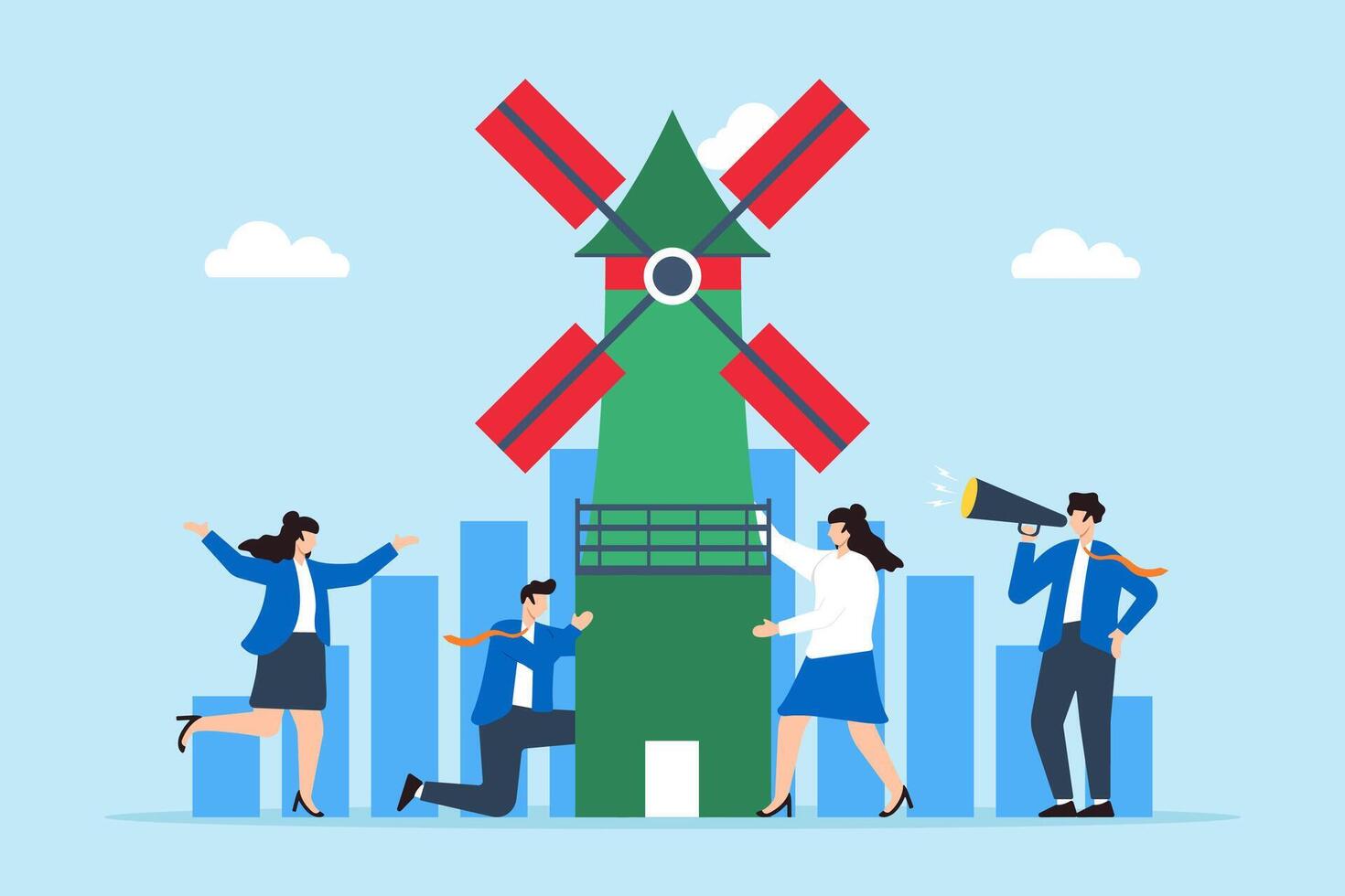 Harnessing market energy, strategic innovation, data-driven efficiency, sustainable business growth concept illustration. Team of analysts building windmill with bar graphs Pro Vector