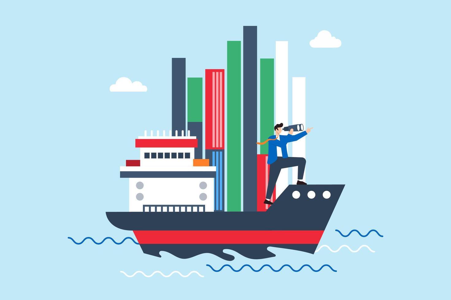 Steering business strategies, data-driven navigation, strategic planning, overcoming market challenges concept illustration. Analyst navigating ship with bar graphs Pro Vector