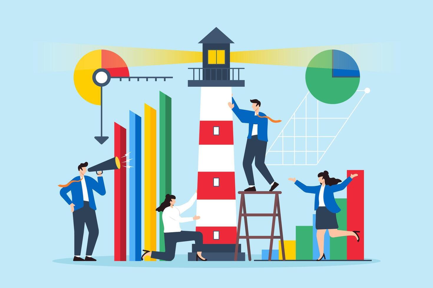 Guiding market strategy, data-driven navigation, strategic foresight, illuminating business paths concept illustration. Team of analysts constructing lighthouse with bar graphs Pro Vector