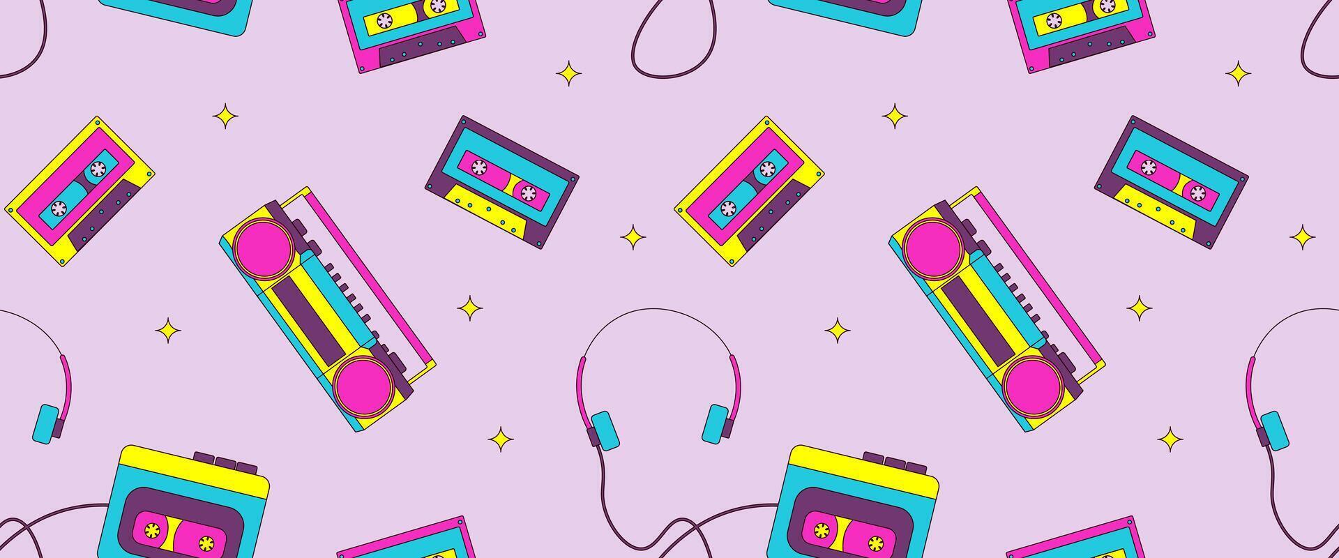 Seamless Pattern with 90s Retro Elements, Music Objects Pro Vector