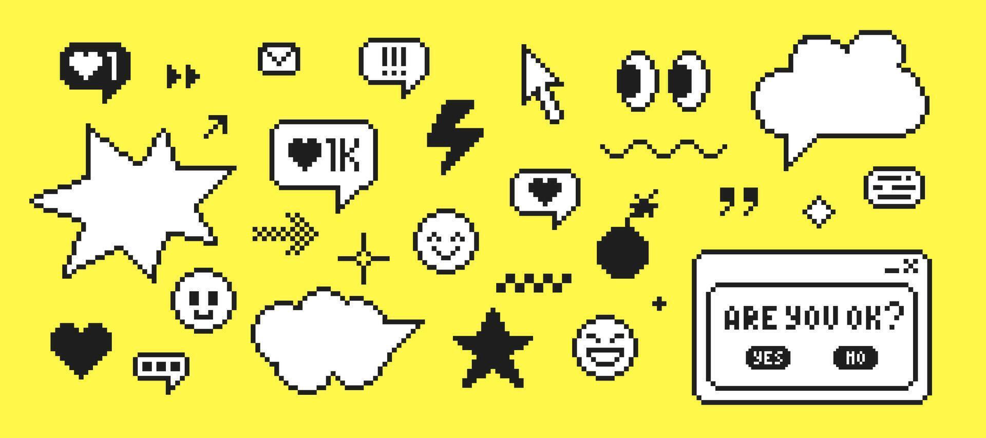Set of pixel art elements in 90s style. Message boxes and popup user interface elements. illustration. Pro Vector