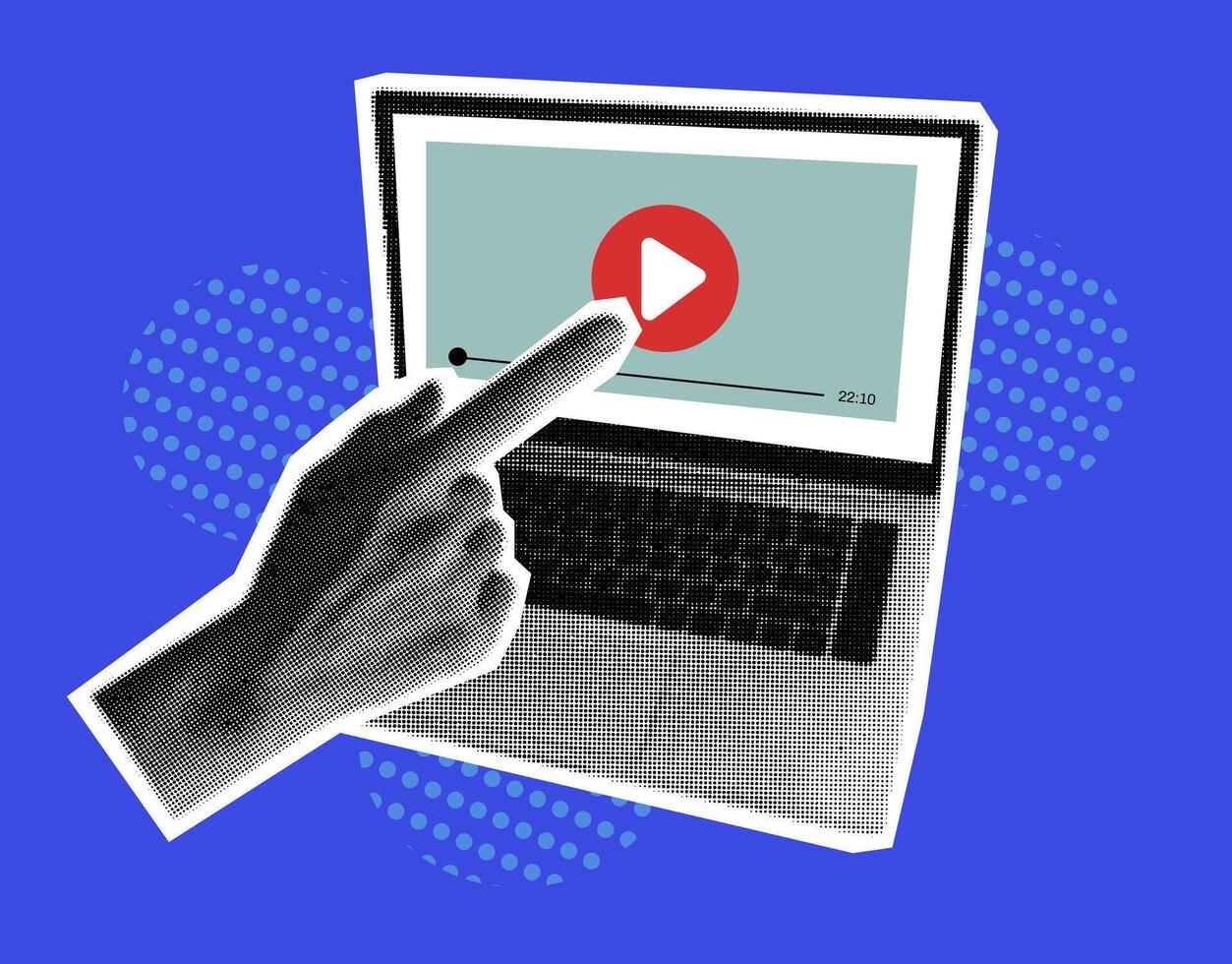 Halftone hand push button play in trendy collage style. Laptop with player. Fingers touch, click or tap. Pro Vector