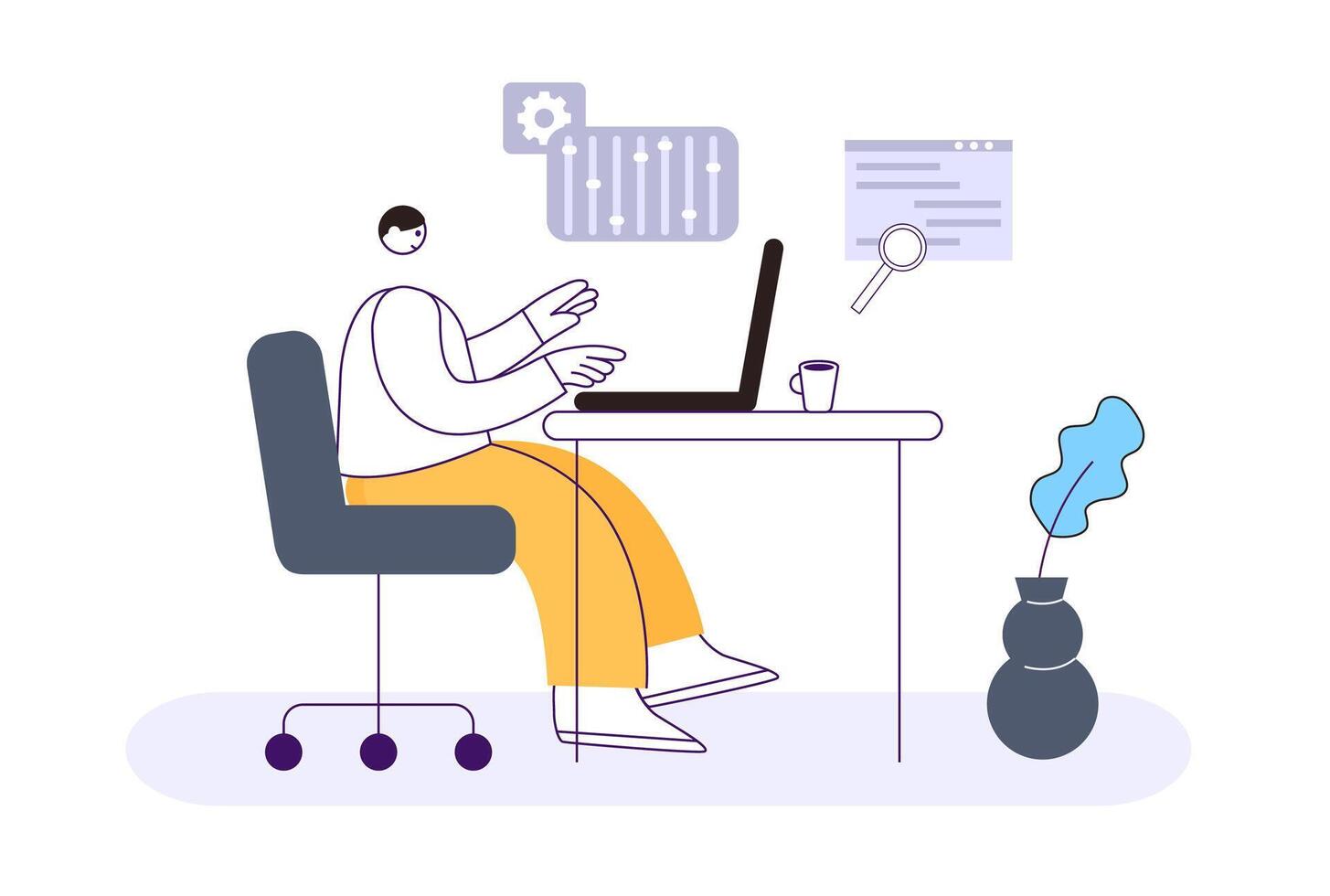 Programmer, software developer. Man sitting at desk with laptop and coding. Employee at work or freelancer Pro Vector