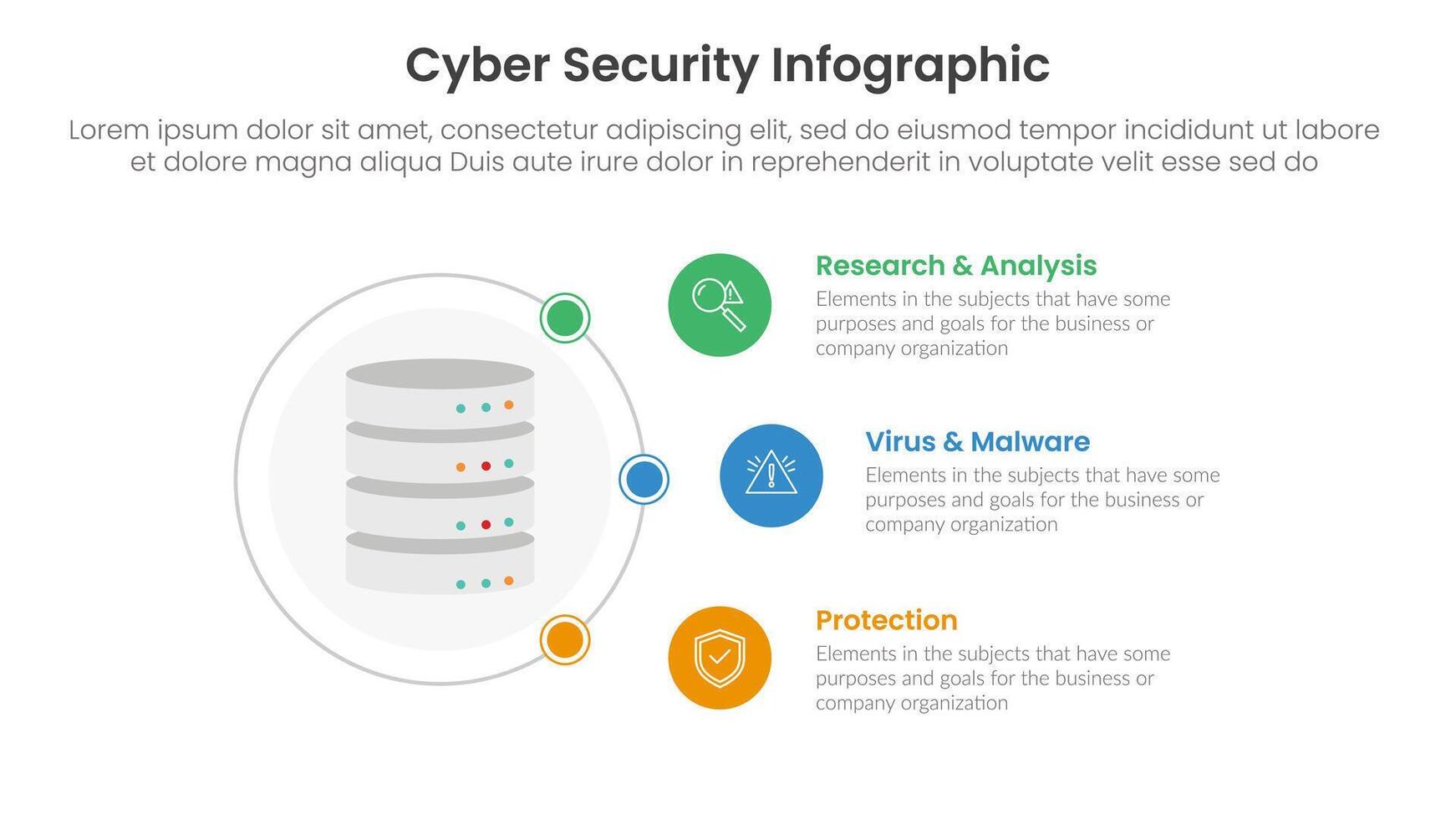cybersecurity technology infographic template banner with server on outline circle with circle point with 3 point list information for slide presentation vector
