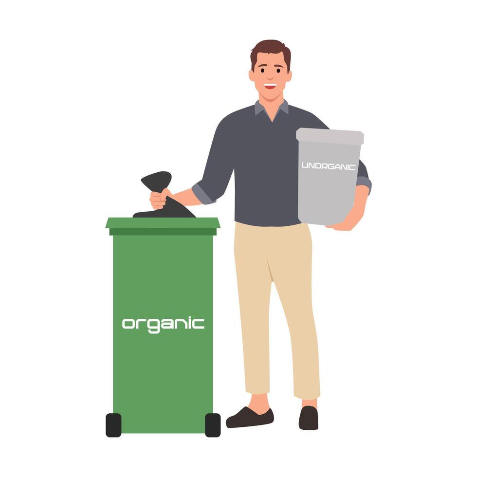 Man sorting garbage. Guy stand near bins sort trash and plastic in containers. Pro Vector