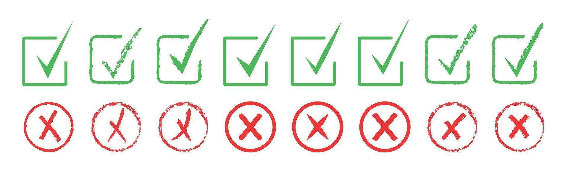 Set of green checkmarks on white background. Green tick. Isolated. Correct. Trendy icons. Symbol sign. Hand drawn. Button. Grunge texture. Brush. Ok. Verified. Textbox. Frame. Red cross. Right, wrong Pro Vector