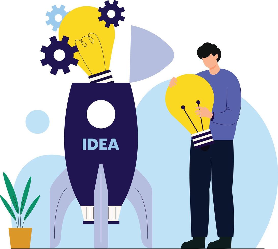 a man thinking process to finding idea at rocket item simple flat style design Pro Vector