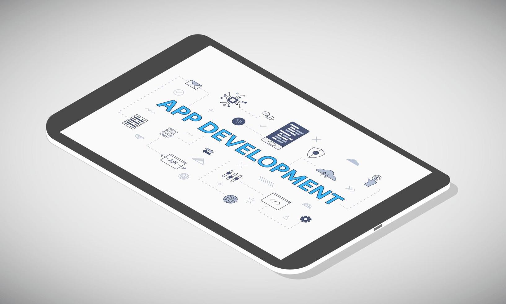 mobile app development concept on tablet screen with isometric 3d style vector
