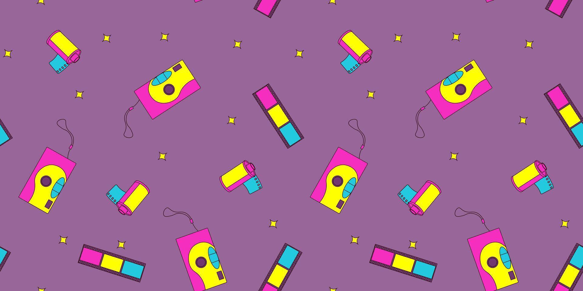 Seamless Pattern with 90s Retro Elements, Photo Objects on a Purple Background Pro Vector