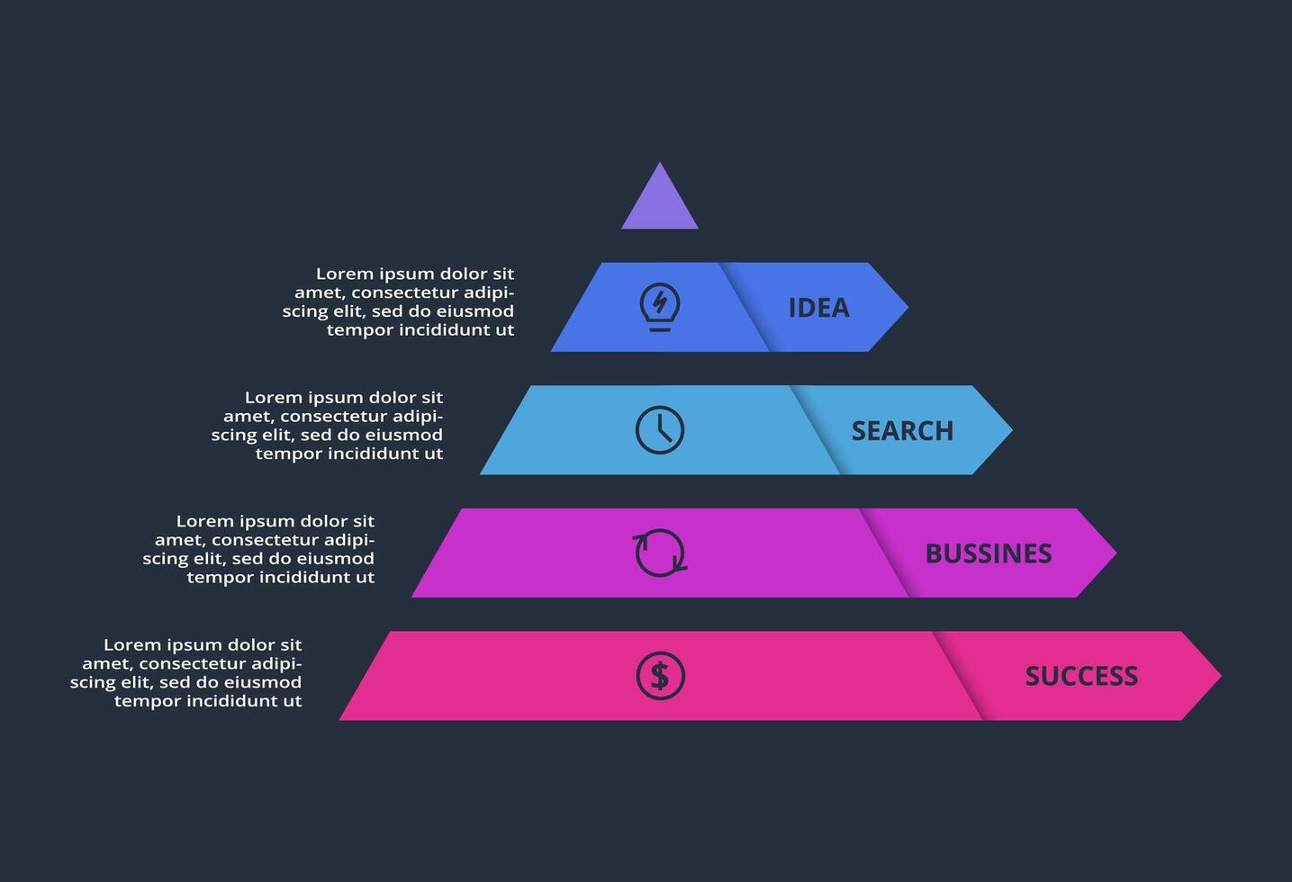Triangle infographic with 5 elements, presentations, illustration. Template for web on a black background. Pro Vector