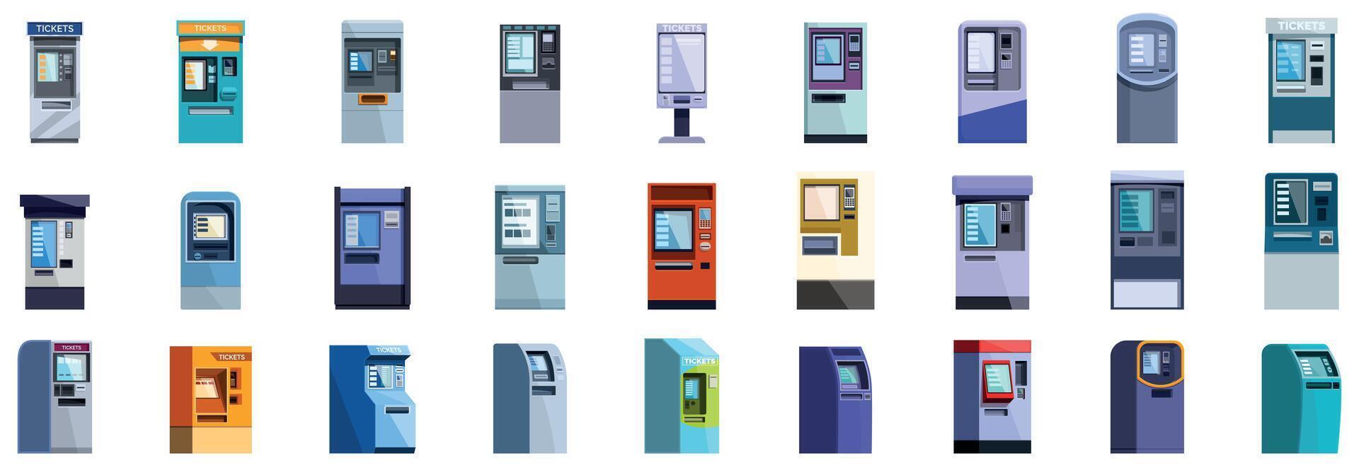 Subway ticket machine icons set. Collection of modern payment terminals showing different designs and interfaces Pro Vector