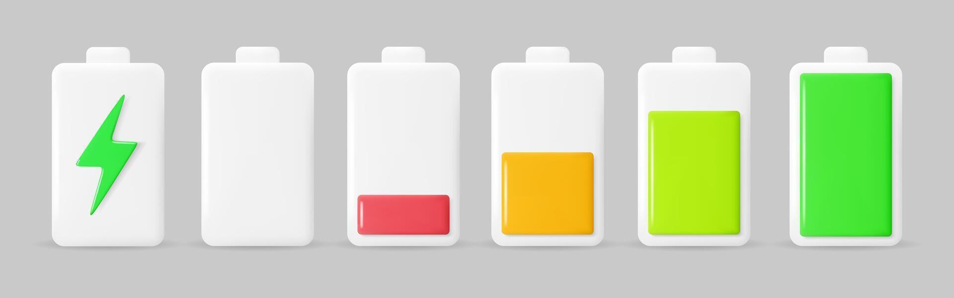 Battery charge indicators at different charge levels from empty to full. 3D realistic design. illustration Pro Vector