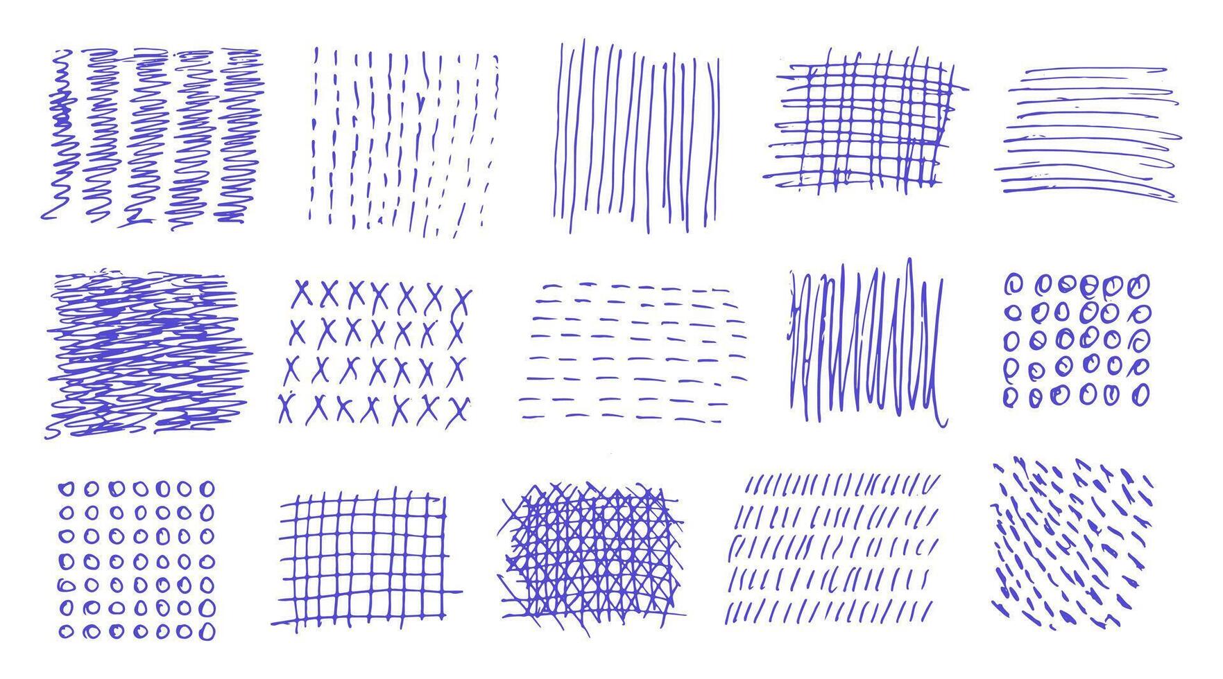Set of different pen stroke textures. Lines, dots and swirls. Marker patterns, grunge scribbles, brush strokes. Set of abstract shapes and curves. Hand drawn blue pen scribbles. Pro Vector