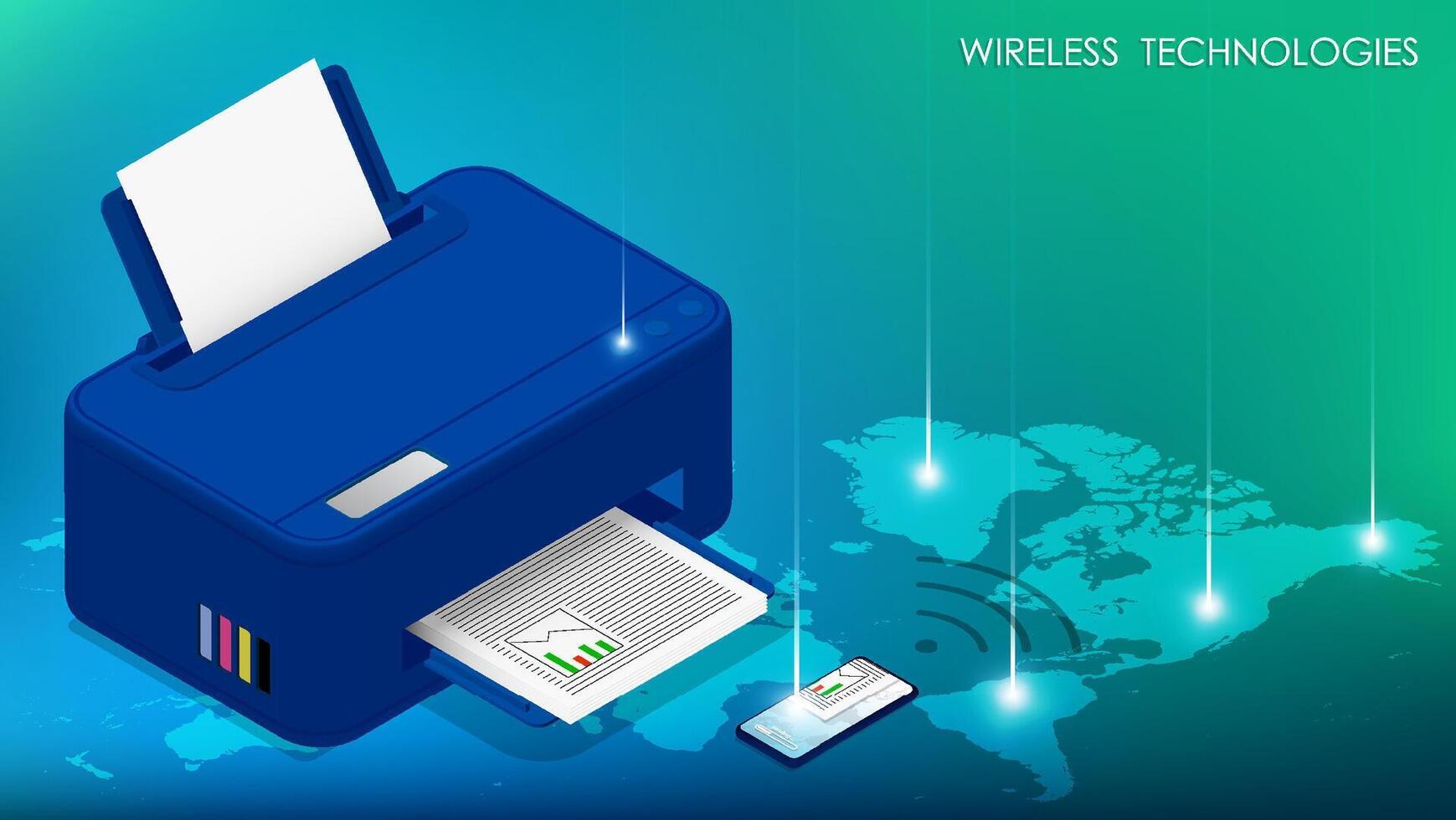 Wireless technology concept. Smartphone sends document to printer for printing using wireless network. Communication between digital devices. Pro Vector